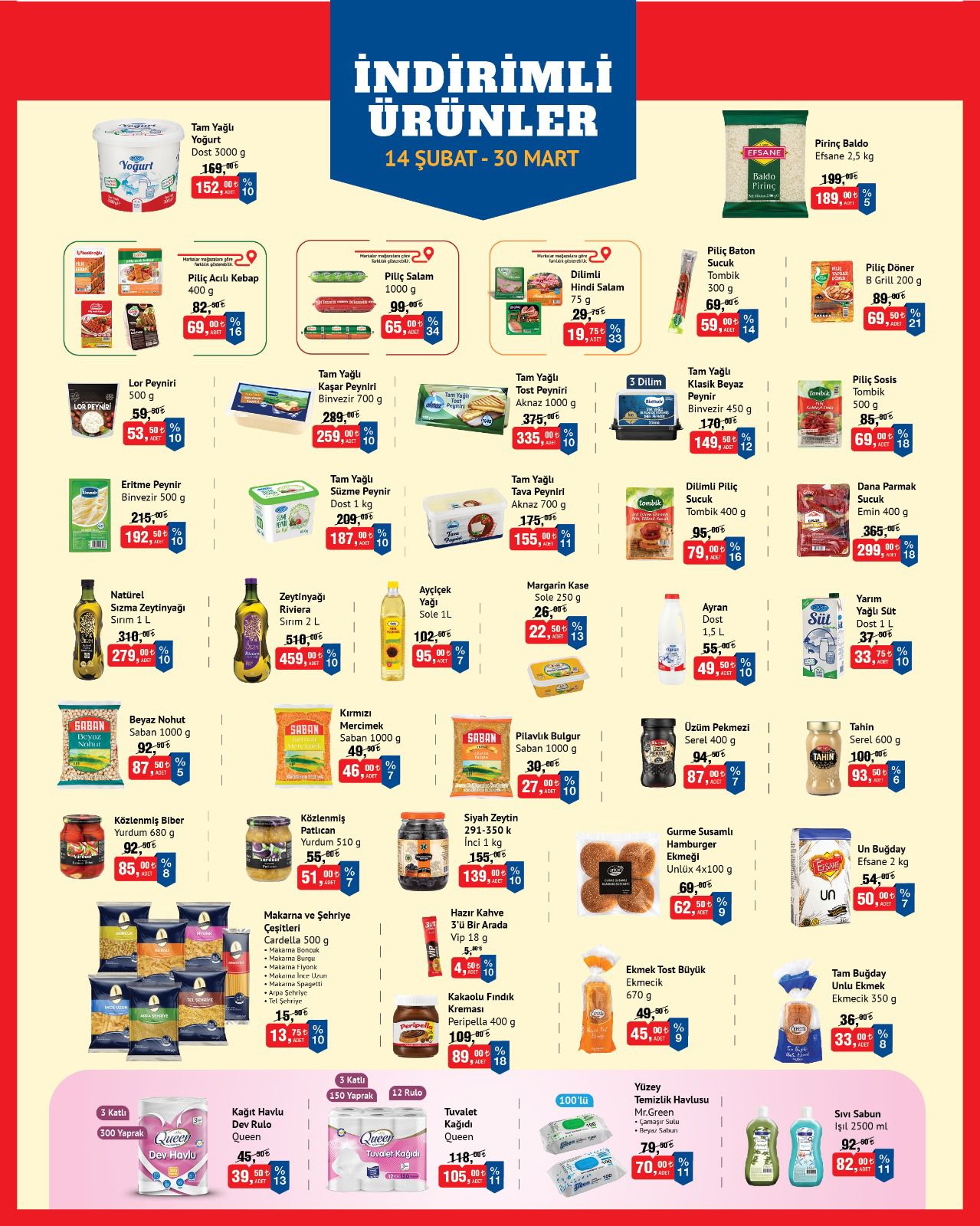 14 Şubat – 30 Mart tarihleri arasında geçerli indirimli ürünler kampanyası başladı. Temel gıda ürünleri, süt ve süt ürünleri, bakliyat, yağ çeşitleri, kahvaltılık ürünler, et ve şarküteri ürünleri ile temizlik ürünlerinde dikkat çeken fiyatlar raflarda yerini aldı.