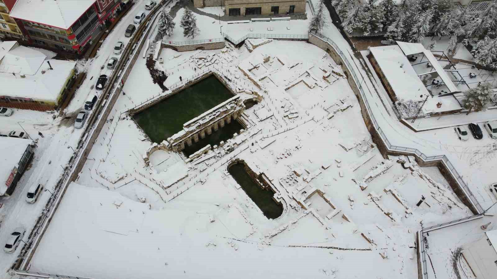 Yozgat’ın Sarıkaya ilçesindeki 2 bin yıllık Roma hamamı, kar altında sıcak sudan yükselen buharla masalsı görüntüler oluşturdu.