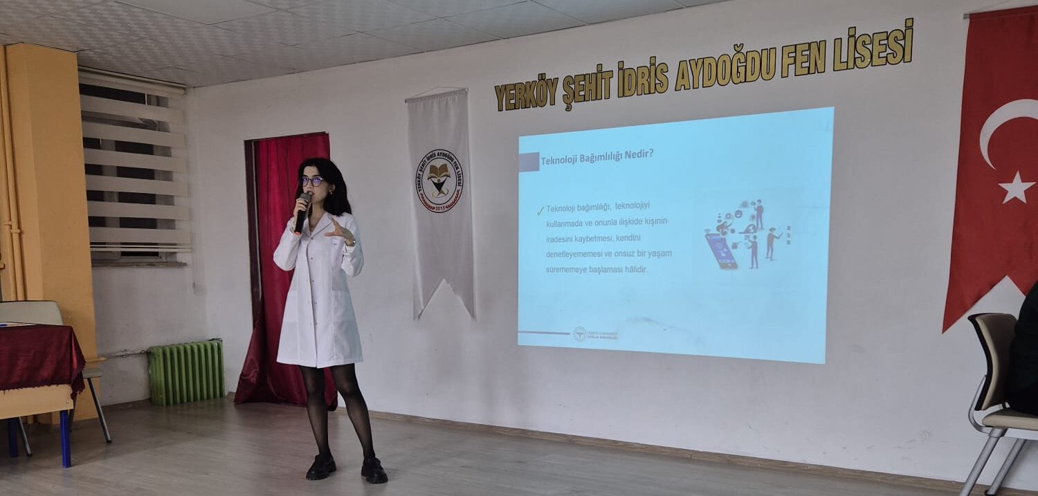 Yerköy İlçe Sağlık Müdürlüğü, Genç Akademisi koordinasyonunda Şehit İdris Aydoğdu Fen Lisesi öğrencilerine yönelik bir eğitim programı gerçekleştirdi. Program kapsamında teknoloji bağımlılığı ve dijital çağda zihinsel sağlığın korunması konuları ele alındı.