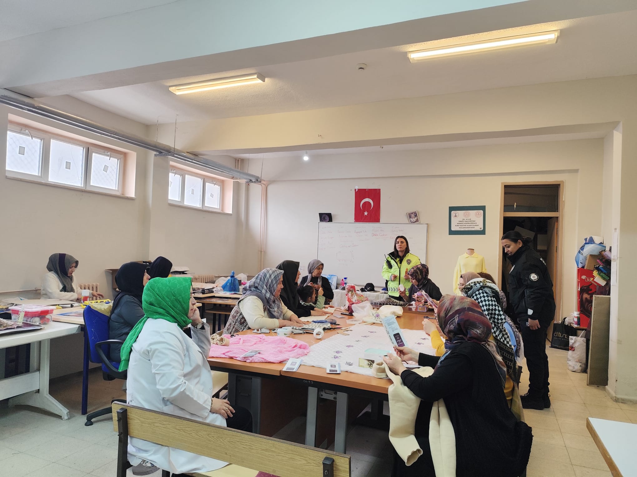 Yerköy Halk Eğitim Merkezi Müdürlüğü kadın kursiyerlere yönelik anlamlı bir bilgilendirme etkinliğine imza attı. Mehmet Akif Ersoy Ortaokulu’nda devam eden Giyim Üretim Kursunda eğitim gören kadınlara Yerköy Emniyet Müdürlüğü’nde görevli polis memurları tarafından KADES – Kadın Destek Uygulaması tanıtıldı.