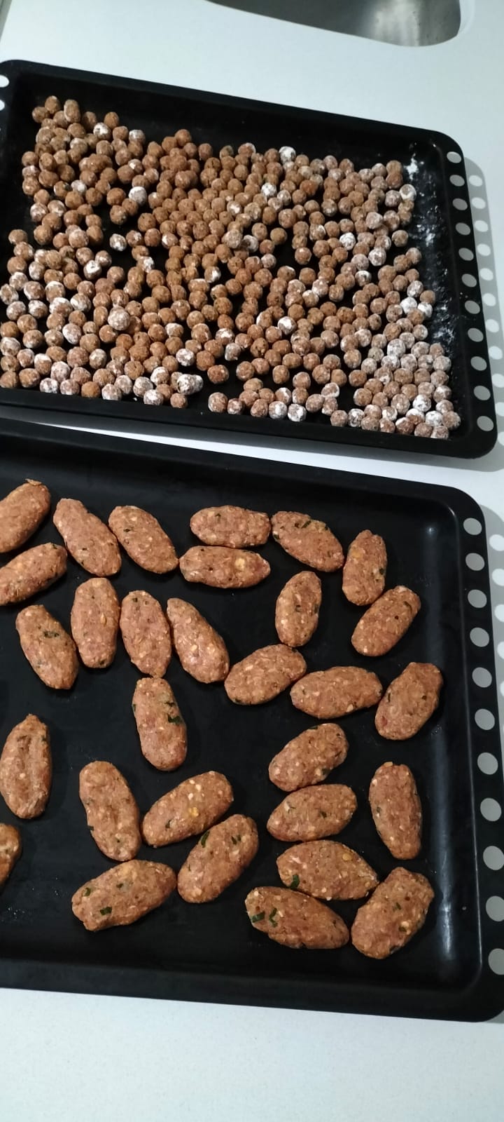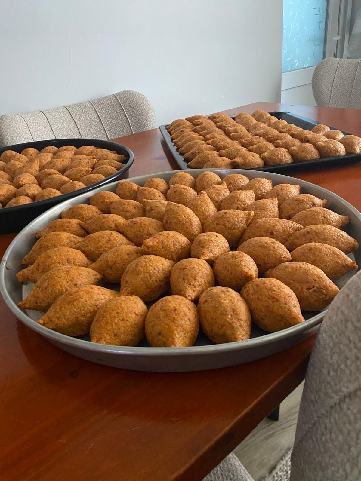 Bir başka karede ise yuvarlak tepsilere dizilmiş, altın rengini alan içli köfteler göze çarpıyor. Ramazan boyunca hem iftar hem de sahur sofralarında ikram edilmesi planlanan köfteler, titizlikle şekillendirilip tepsi tepsi hazırlandı.
