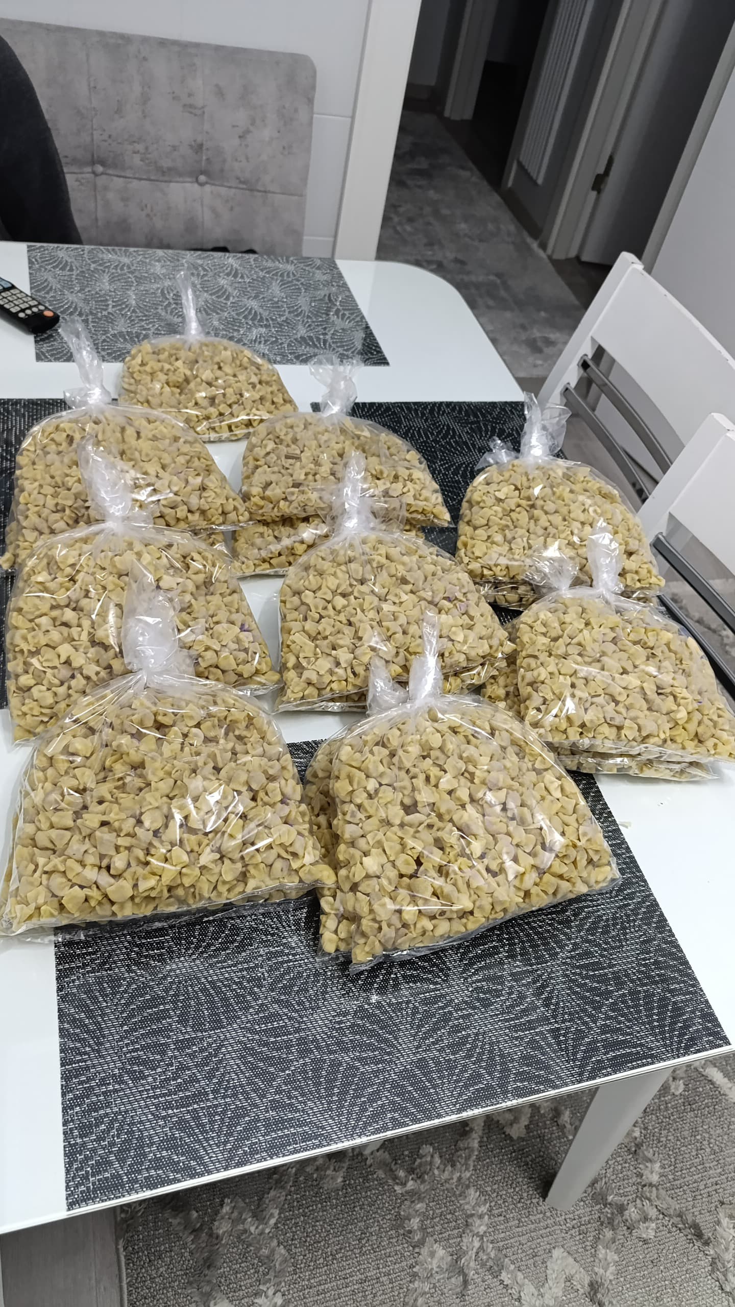 Ev ortamında imece usulü yapılan hazırlıklarda önce büyük leğenlerde mantı hamurları hazırlandı. Saatler süren çalışmanın ardından minik minik kapatılan mantılar paketlenerek muhafazaya alındı. Fotoğraflarda onlarca poşet dolusu mantının sofraya hazır hale getirildiği görülüyor.