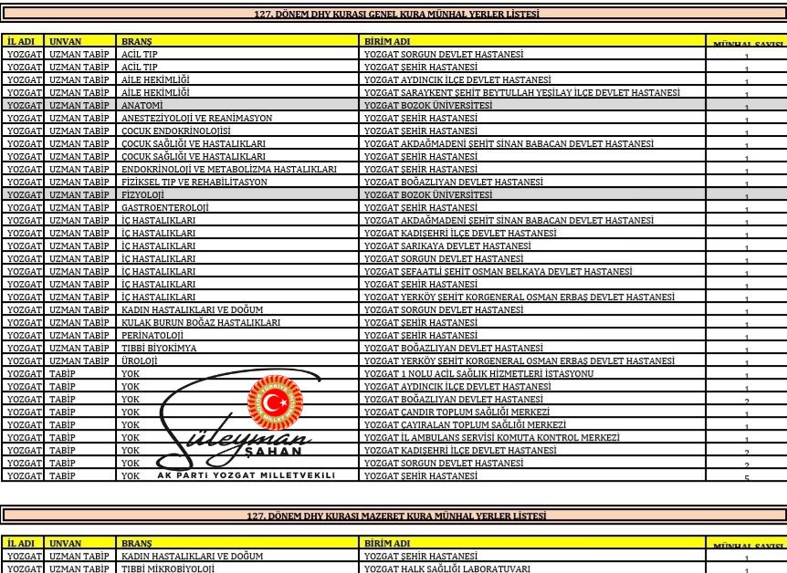 Atama listesine göre Yozgat merkez ve ilçelerde; acil tıp, aile hekimliği, anesteziyoloji ve reanimasyon, çocuk sağlığı ve hastalıkları, iç hastalıkları, kadın hastalıkları ve doğum, kulak burun boğaz, perinatoloji, gastroenteroloji, fiziksel tıp ve rehabilitasyon, üroloji ve çeşitli diğer branşlarda uzman hekim görevlendirmesi yapıldı.